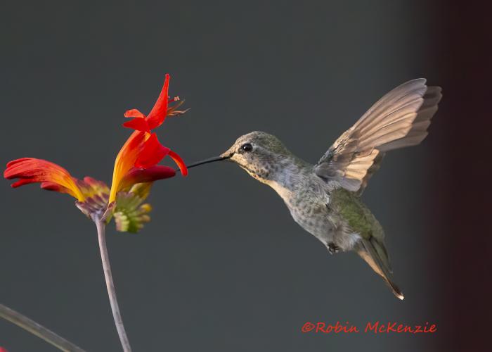 2. Crocosmia. A real hummingbird favorite, this bulb grows 4' tall and can get very big unless divided every few years in Fall. Hummingbirds will spend hours drinking, guarding and fighting over these tubular flowers, but I have seen them share a large plant in the late evening. Crocosmia will begin the fireworks show just before the 4th of July and they'll last only a few weeks but are well worth it for the show.