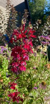 - Lobelia Cardinales - Cardinal Flower. Another terrific late-summer bloomer, this N American native is easy to grow from seed and in our area is often grown as an annual. This one is making its appearance for the second year in my butterfly beds. They like full sun (for the best color) or light shade and prefer evenly moist, well drained soils. They will tolerate drought, poor soils, and are very hardy. They display tons of flowers on tall, upright stems that are frequented by hummingbirds throughout the day. Dead head these for neat appearance and longer bloom. Deer and rabbit resistant.